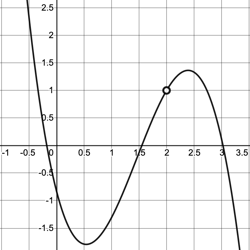In Figure 1 the graph of a function is given, but something is wrong. The graphic card failed and one portion did not render properly. We can’t see what is happening in the neighborhood of \(x=2\text{.}\)
