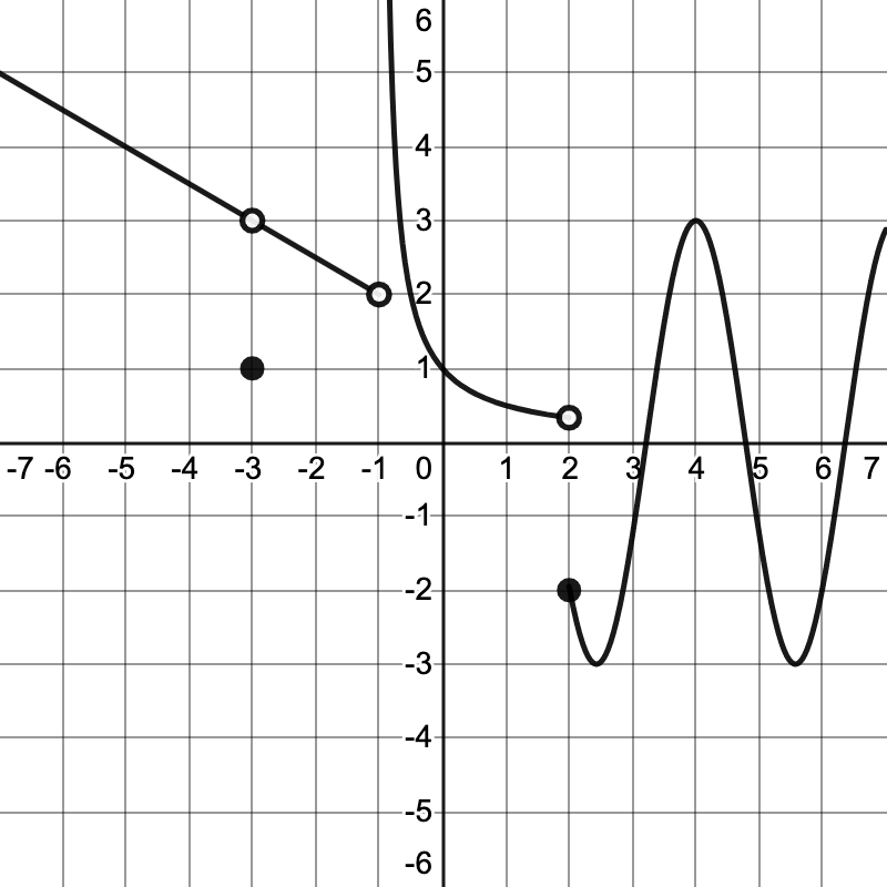 \(\displaystyle \lim_{x\to -3} f(x)=-4\text{,}\) but \(f(-3)=0\text{.}\)