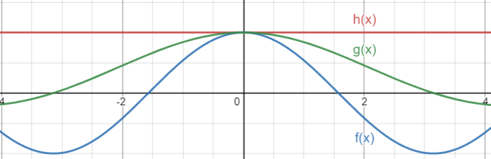 Match the functions \(f(x), g(x), h(x)\) in the picture to the functions \(\cos(x), 1, \frac{\sin(x)}{x}\text{.}\)